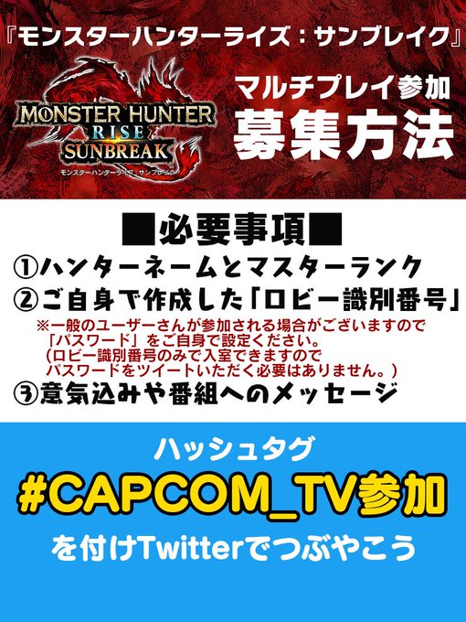 『モンスターハンターライズ:サンブレイク』で番組レギュラー陣と一緒にプレイしたい方を募集中!参加方法は番組をチェック。 twitter.com/i/broadcasts/1… #CAPCOM_TV #MHサンブレイク