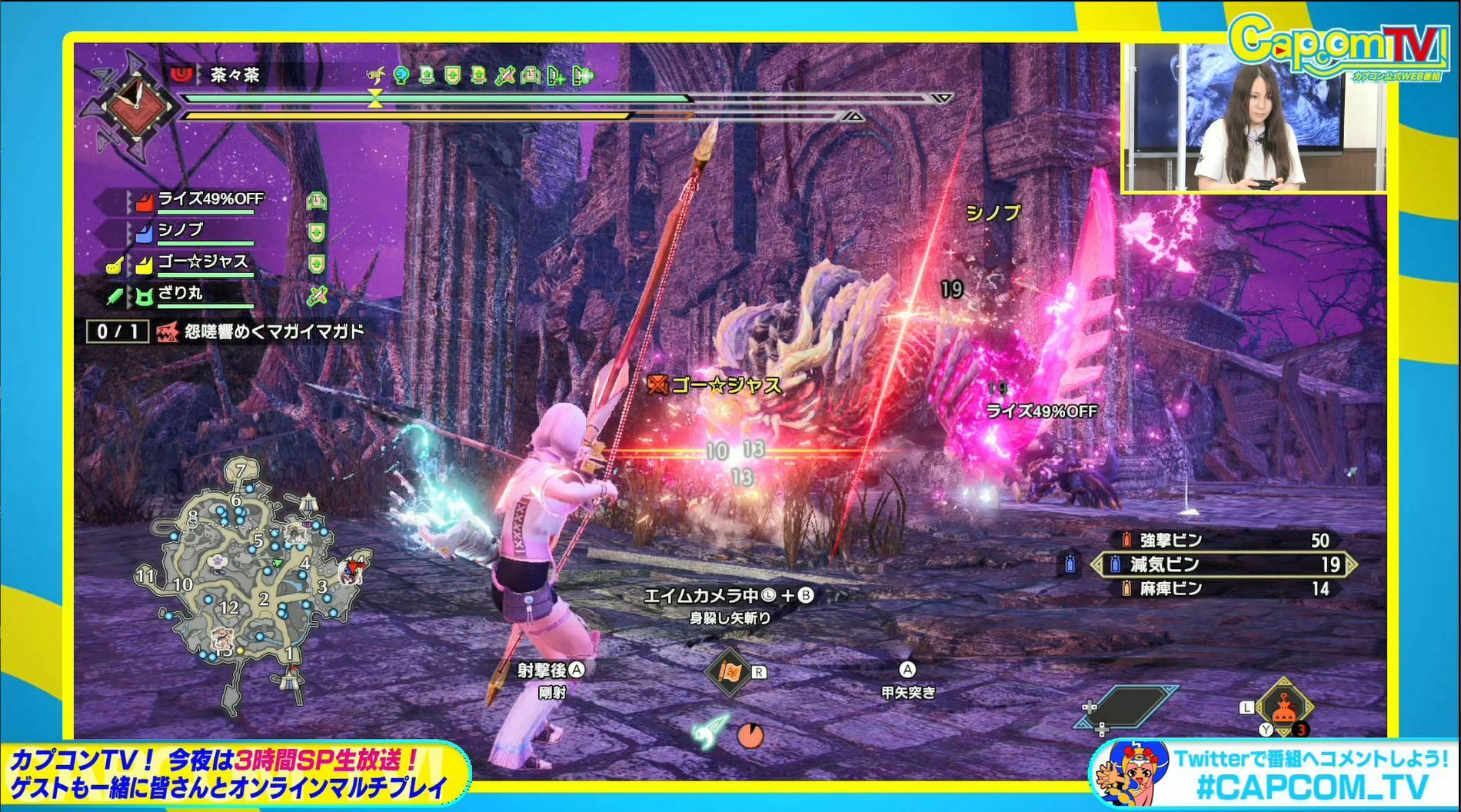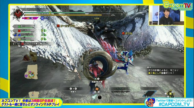 識別番号を投稿→出演者3名「ざり丸」 「モナ乃小町」「ゴージャス」「茶々茶」)がお邪魔します。 twitter.com/i/broadcasts/1… #CAPCOM_TV #MHサンブレイク