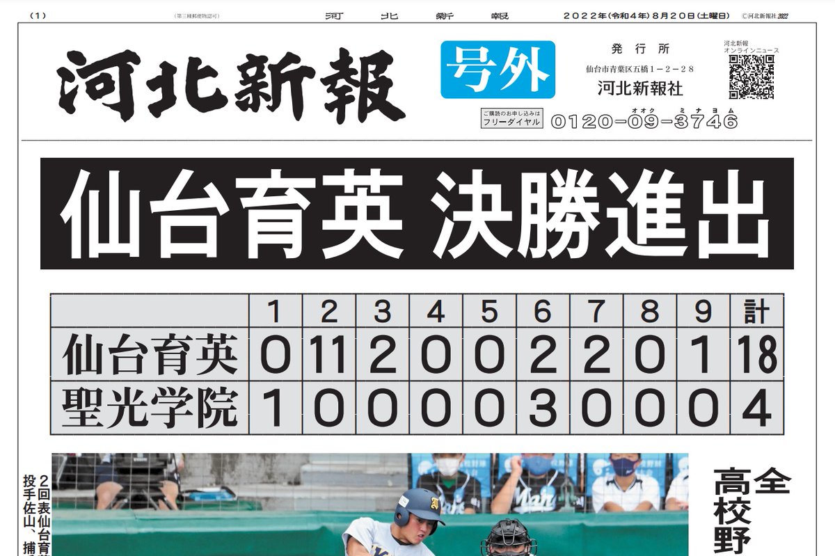 (本日の河北新報紙面にて仙台育英学園高校の合同応援広告を掲載しております)