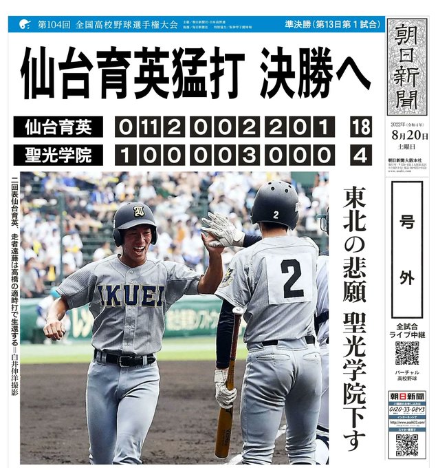 第104回全国 #高校野球 選手権大会の準決勝第1試合は、#仙台育英 (宮城)が #聖光学院 (福島)を18-4で破り、夏の大会では2015年以来7年ぶり3度目の決勝進出を決めました。