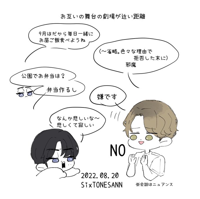 樹「俺とランチしようや!銀座行こうや!日比谷公園で食べようや!俺早起きしてサンドイッチ作るから!」優吾と舞台間にランチしたすぎる田中樹カワイイカワイイカワイイ🥺 #SixTONESANN