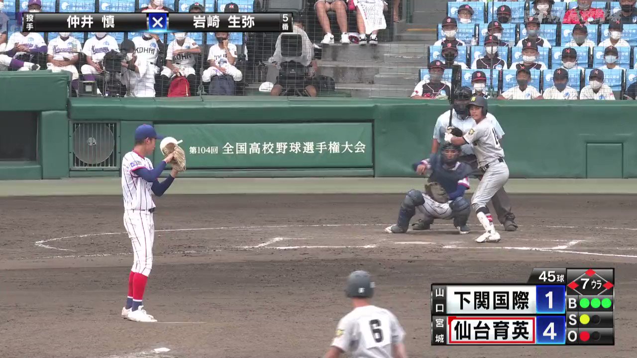 #下関国際 5回裏途中、力投を続けてきたエース古賀康誠から、背番号6仲井慎へ投手交代!!ここでもスパッと采配、決断。そして、仲井慎、追加点は許さず!!試合は、5回裏までを終了し、仙台育英が3-0とリード。後半戦へ!! pic.twitter.com/Nrpi4CuP4G