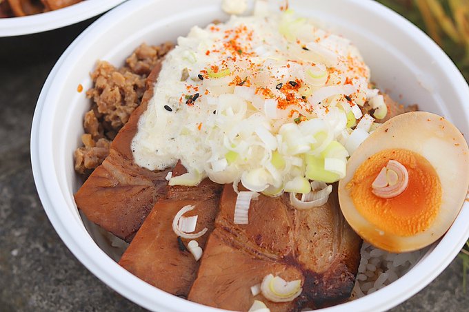 水戸のスタグルと言えば龍神飯。ポケットファームどきどき(茨城町)が作る渾身のお肉丼。チャーシュー3枚にバラチャー、煮卵にタルタル。タルタルは無し、あり、マシマシ、竹田城雲海と無料トッピ可能。チャーシューマシ2枚100円。この為だけにスタジアム来てもおかしくない。700円