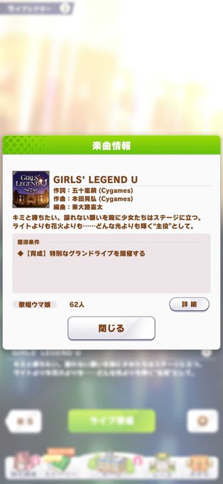 グランドライブ5回目までに19曲習得していると、イベント楽曲「GIRLS' LEGEND U」が特別仕様になり必ず大成功します!