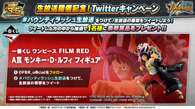 本アカウントをフォローして「#バウンティラッシュ生放送」を付けて番組の感想をツイートすると、抽選で1名様に「一番くじ ワンピース FILM RED ルフィ フィギュア」をプレゼント🎁