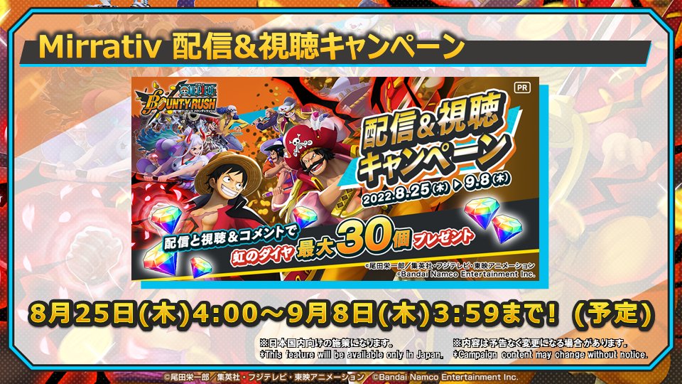 「FILM RED シャンクス」「FILM RED ベン・ベックマン」の登場を記念して、Mirrativにてキャンペーンを開催予定!