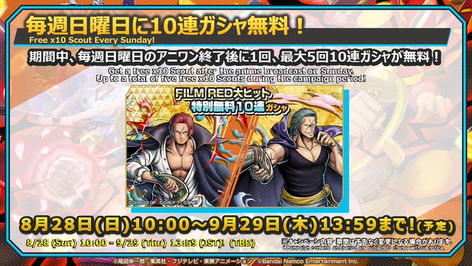 8/28より毎週日曜日に「FILM RED大ヒット特別無料10連ガシャ」を全5回にわたって開催!