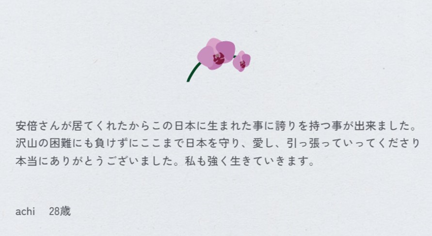 8/26 今朝の時点で3万人を超えています。夜中も多くのメッセージをいただきました。ちょうど30,000人目にあたるメッセージは02:15でした。皆さまにもご紹介します。引き続き、国葬日までよろしくお願いします。