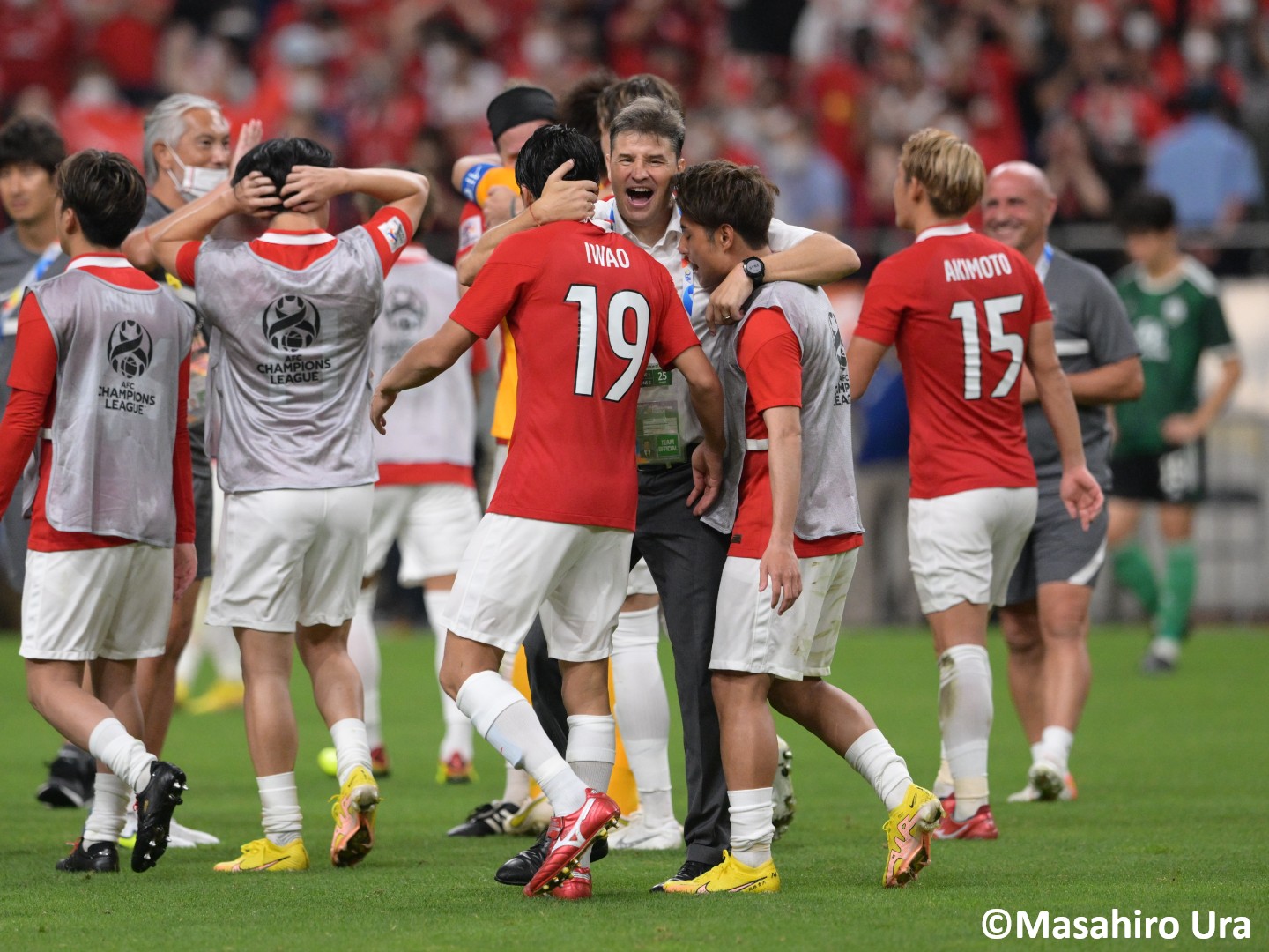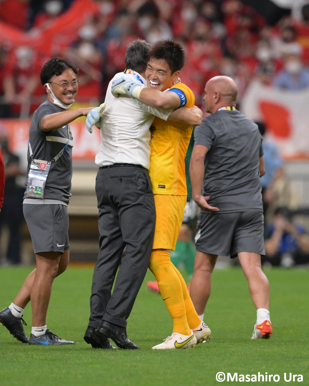 好セーブでチームを救ったキャプテンの #西川周作 と、#リカルド・ロドリゲス 監督の熱い抱擁。