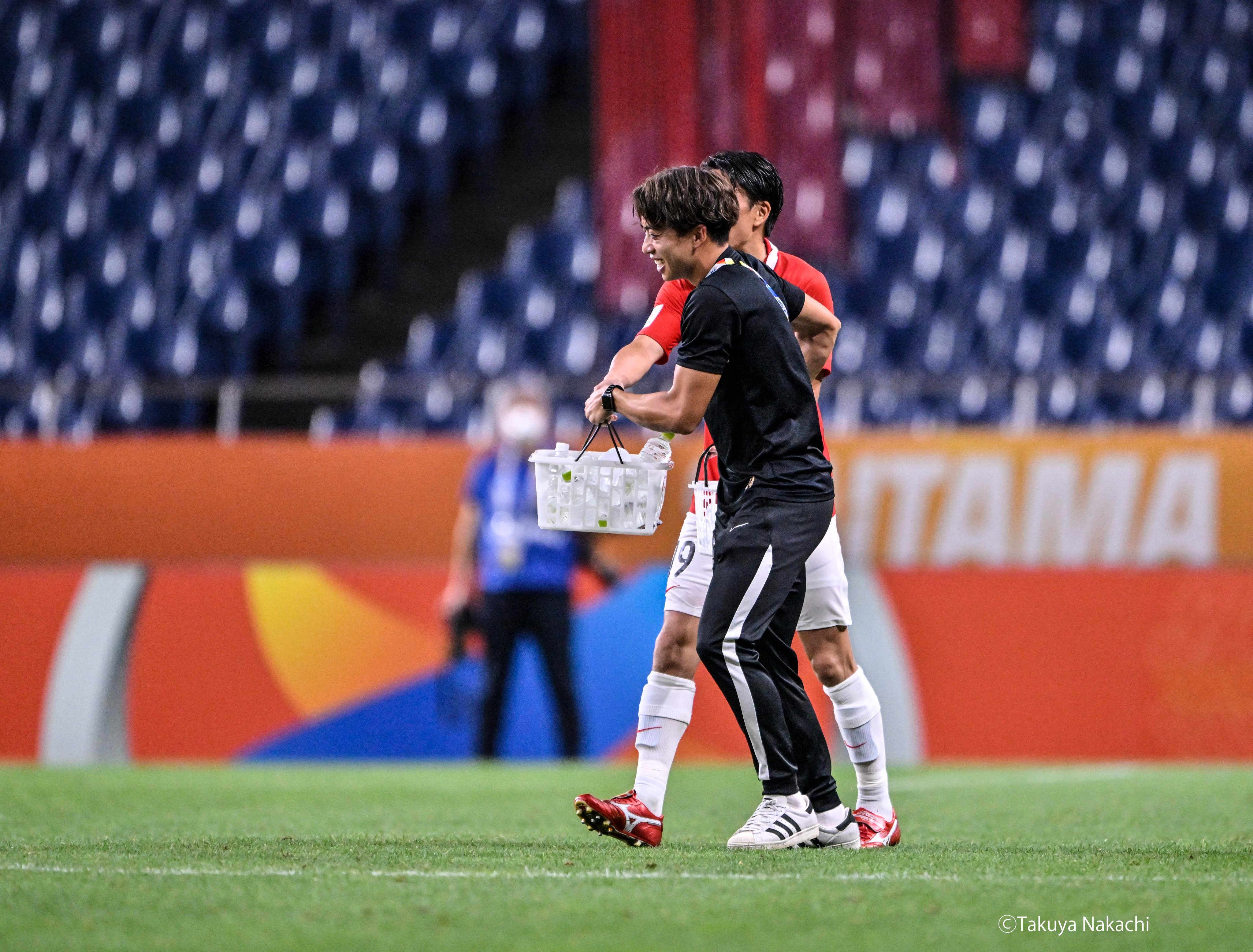 PK戦開始前、旗が埋め尽くす北のゴールに向かっていく周ちゃん