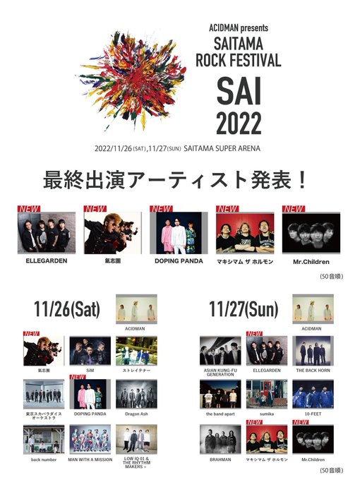#SAI2022 #ACIDMAN #mrchildren #ミスチル #ELLEGARDEN #氣志團 #DOPINGPANDA #マキシマムザホルモン pic.twitter.com/aAybuS2ZoR