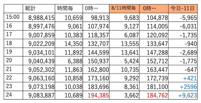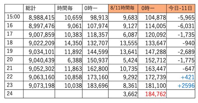 15:12 900万まで1万切りました。16時頃ですね、通常予測なら16:05-16:10頃ですが短縮しますね?