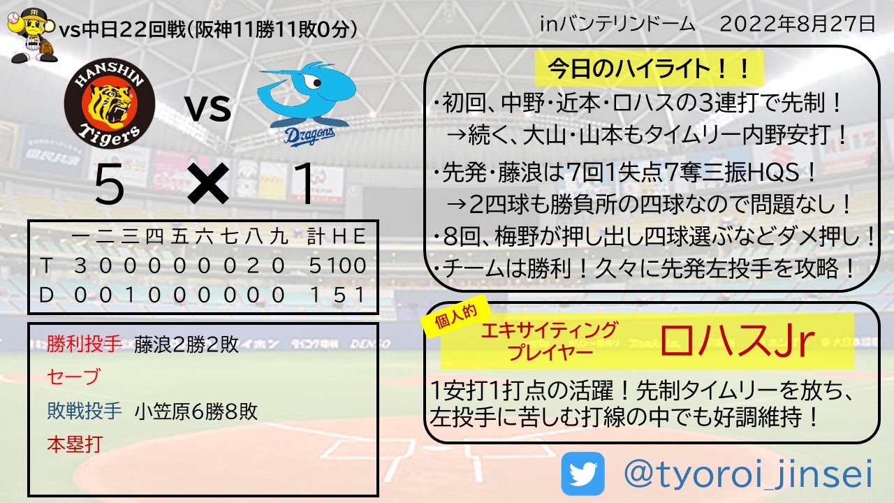 最後はケラーが三者連続三振締め!初回電光石火の先制から終始タイガースペースのナイスゲームやったわ!藤浪は7回5安打1失点で2勝目!明日の森木へ勝利のバトンをしっかり繋いだで!