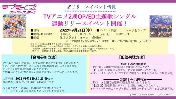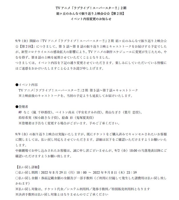 9/9(金)開催のTVアニメ「ラブライブ!スーパースター!!」2期 結ヶ丘のみんなで振り返り上映会☆☆【第2回】について、イベント内容変更のお知らせです。詳細は添付画像をご確認ください。