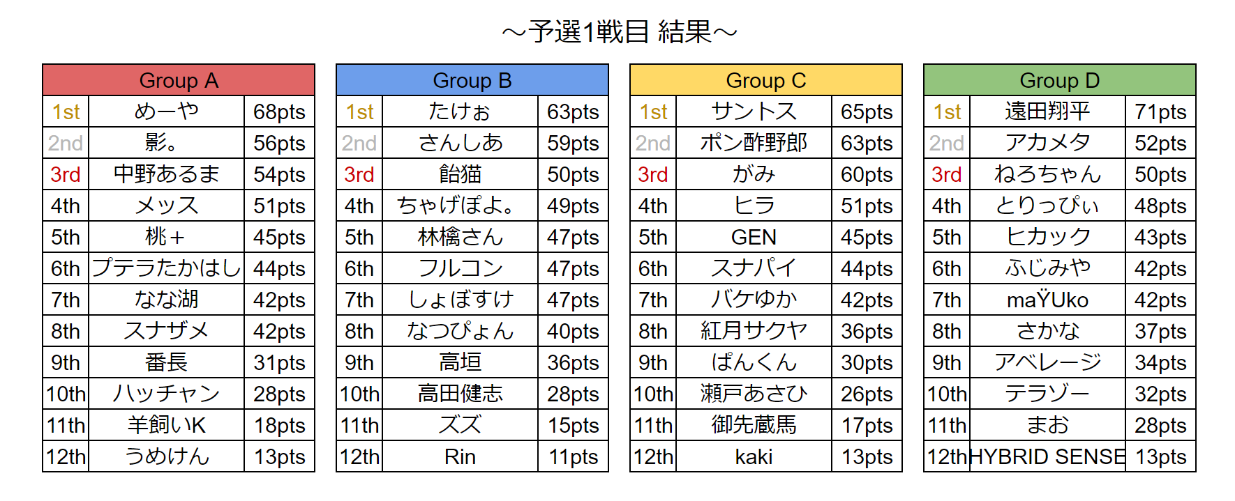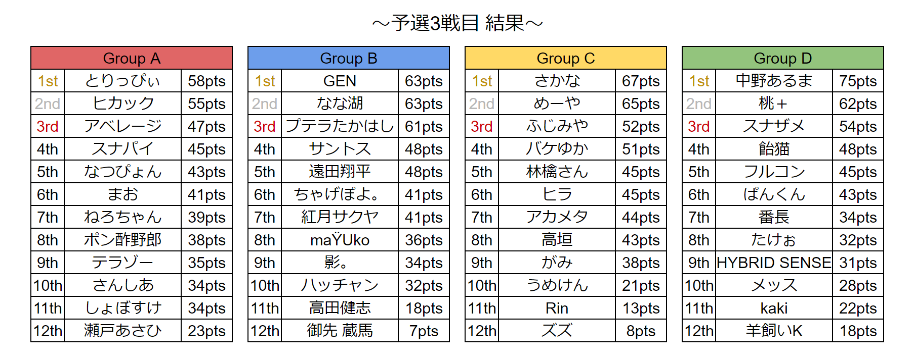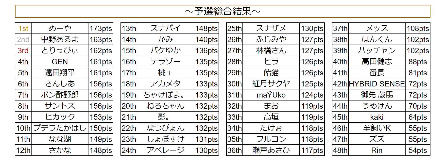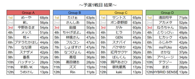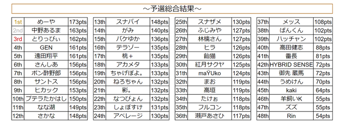 お疲れさまでした!またしても準決勝ラスレで1位取られてまくられてしまいました...!応援してくれたみんなありがとう!燃え尽きてしもうた!決勝もアツくて面白かったね!