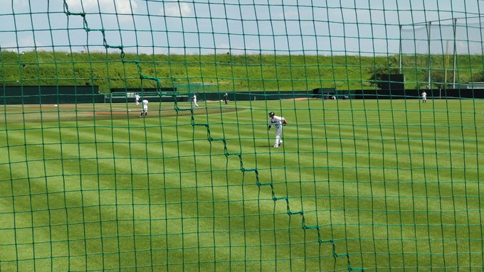 戸田球場の外野は天井まで網目があるので少しズレたところまで誘導してから投げてくれる優しさ。