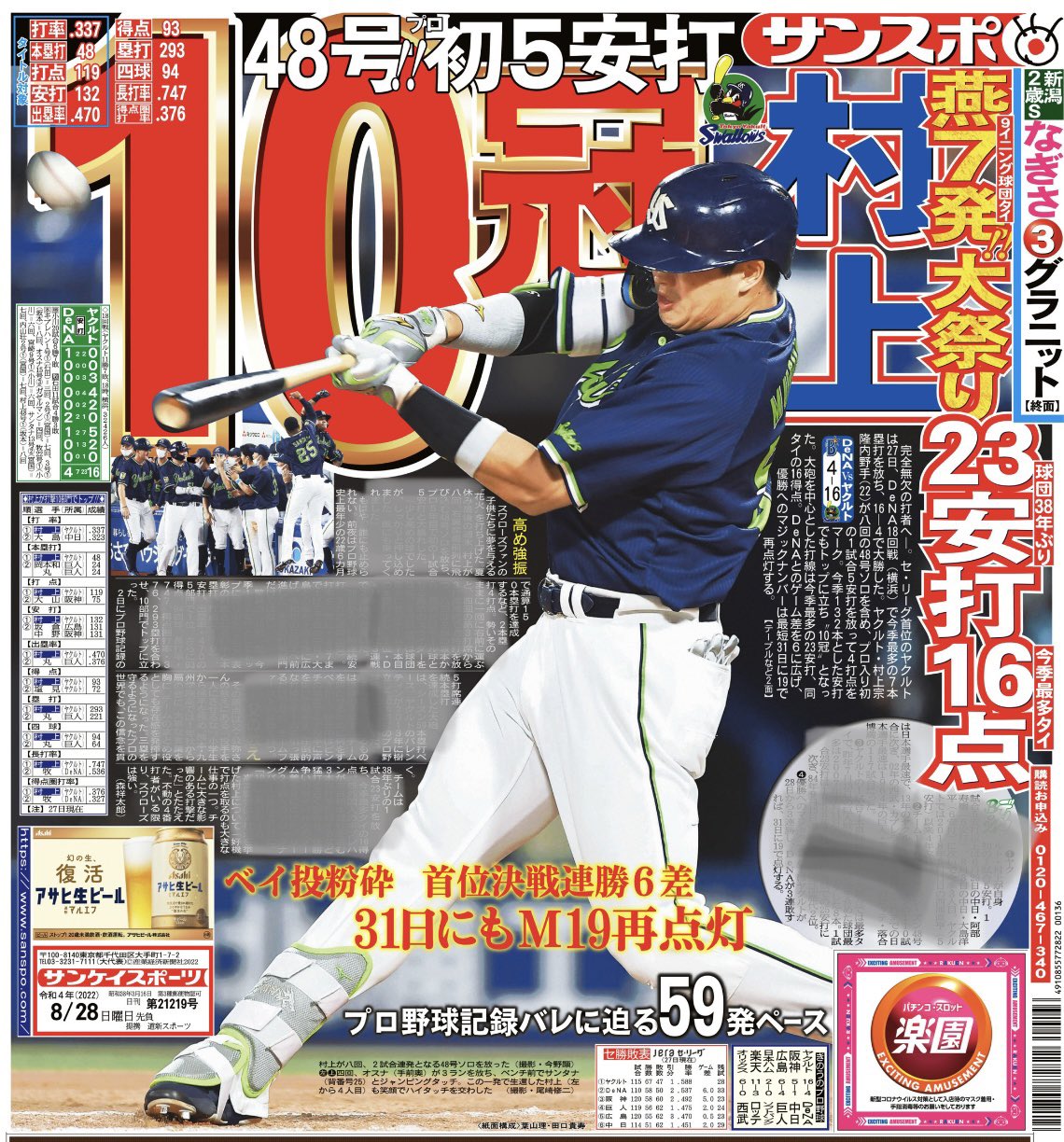 おはようございます☁️本日の #サンスポ(東最終版、電子版)1面は、#村上宗隆 選手!48号ホームランを含む自身初の5安打で、23安打16得点の打線を引っ張りました!打撃主要3冠だけでなく、あらゆる部門でトップに立ち10冠👑#村神様 ここにあり!