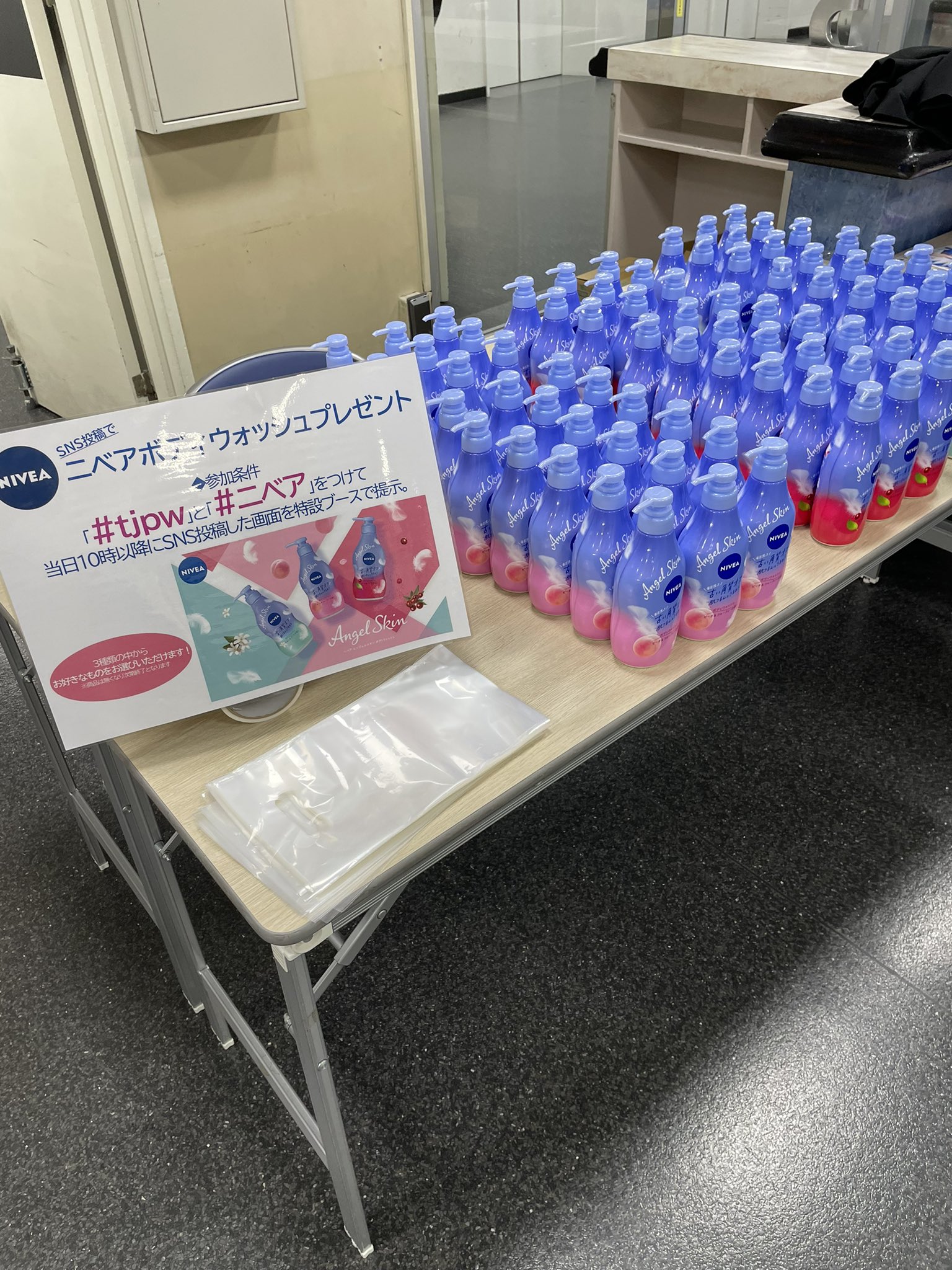本日、後楽園ホールで「#tjpw」と「#ニベア」をつけて午前10時以降にSNS投稿した画面を会場内特設ブースで提示すると、先着でニベアエンジェルスキンボディウォッシュをプレゼントします。