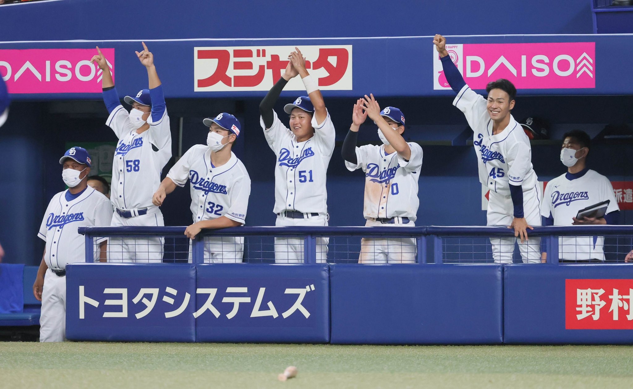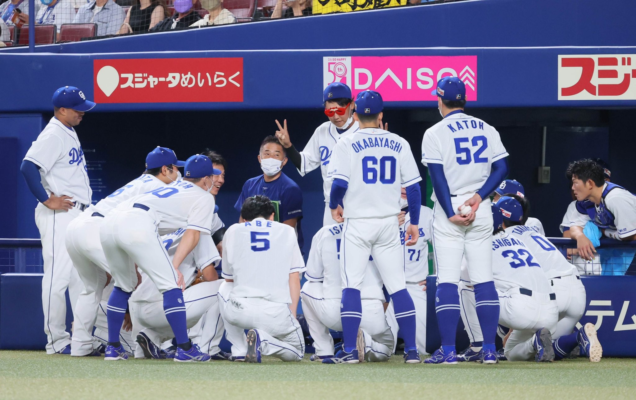 6回の #阿部寿樹 選手の2点二塁打で大喜びする一塁ベンチ