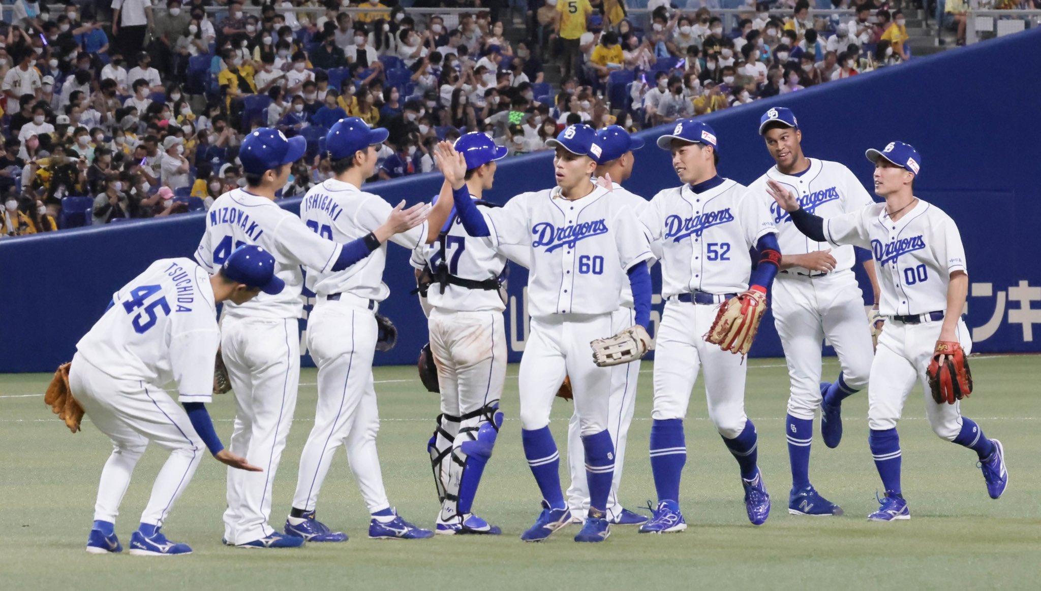 勝利のハイタッチを交わす中日ナイン