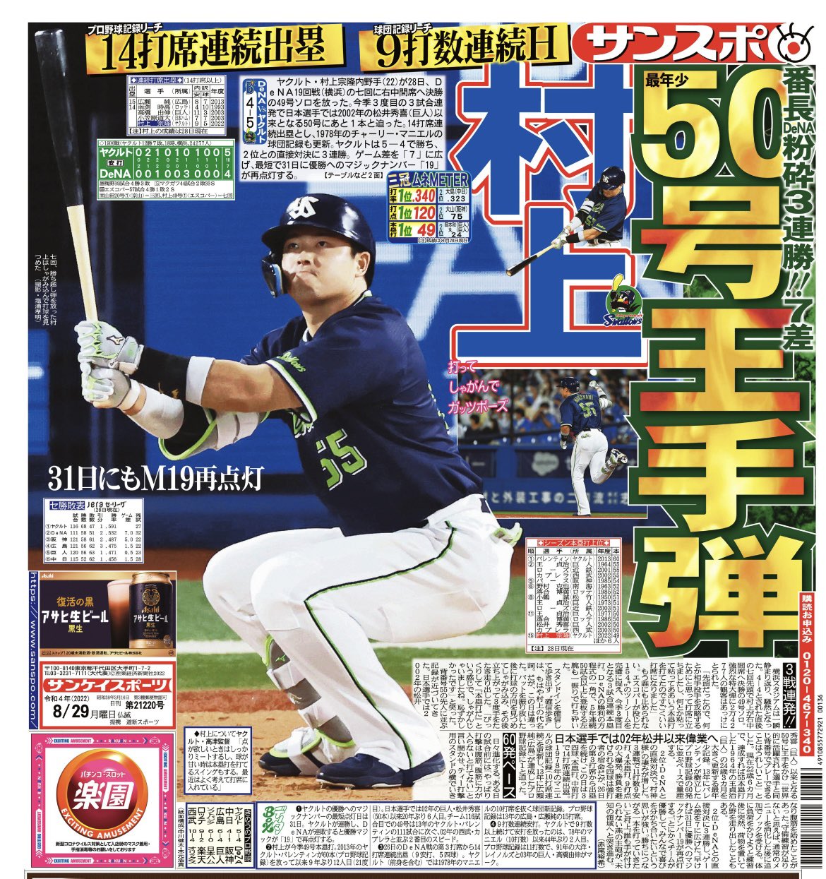 おはようございます☀本日の #サンスポ(東最終版、電子版)1面は、#村上宗隆 選手!日本選手では2002年の松井秀喜以来の50号へ王手をかけ、シーズン60発ペース。プロ野球記録の15打席連続出塁にもあと1に。2位との直接対決3連勝で勢い加速💨