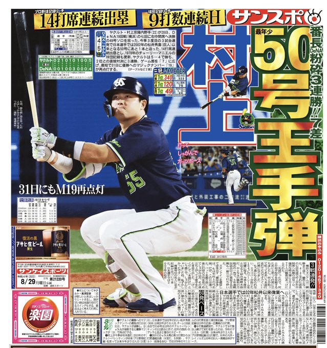 #ヤクルト #村上宗隆、3戦連発で最年少50号王手! 日本選手では02年松井以来の偉業へsanspo.com/article/202208…