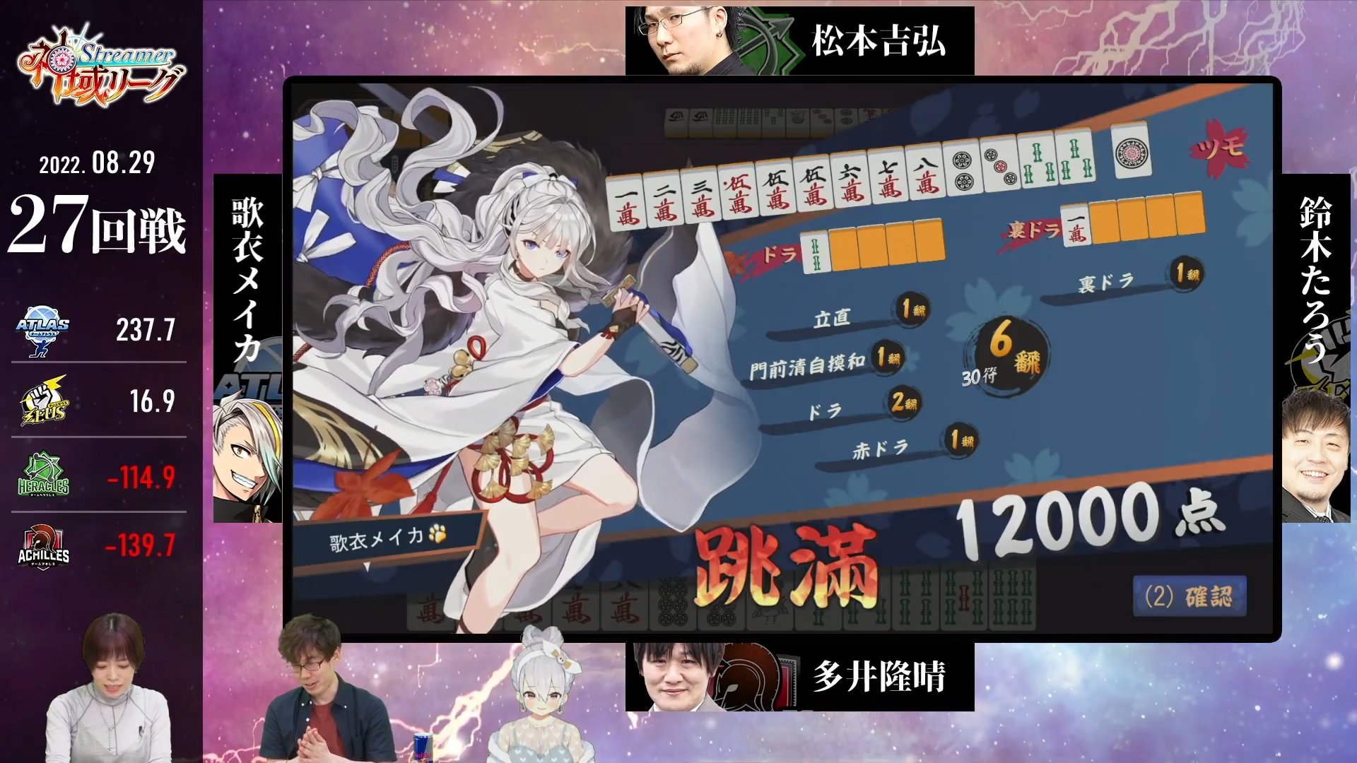 #麻雀 #神域Streamerリーグ #歌衣メイカ #多井隆晴 #鈴木たろう #松本吉弘 #雀魂 #じゃんたま pic.twitter.com/tMOyPjJZkL