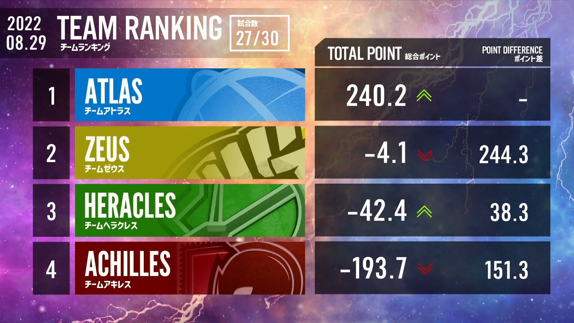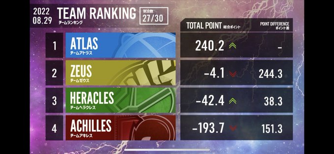 しかし、ゼウス・ヘラクレス・アキレスの3チームも優勝の可能性は残されています。