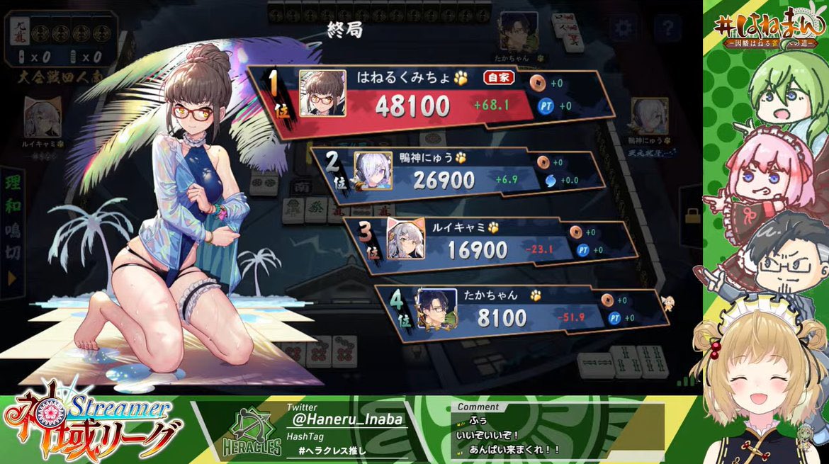 #麻雀 #神域Streamerリーグ #因幡はねる #鴨神にゅう #多井隆晴 #ルイス・キャミー #雀魂 pic.twitter.com/scZuw8kvQO
