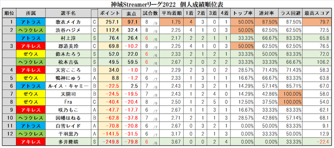 #神域リーグ 第9節終了時点 個人成績順位表