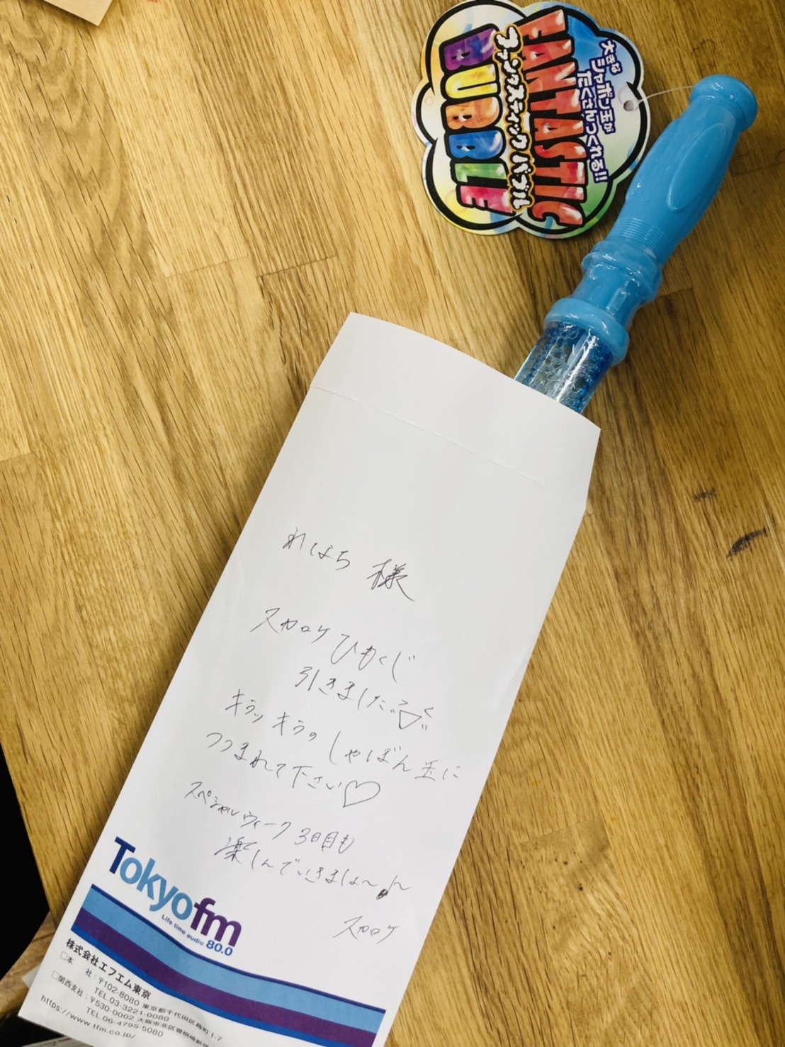 本日、豪華賞品が当選する「スカロケひもくじ」にて、見事浜崎秘書がシャボン玉を引当てましたので、プロデューサーのデスクの上において置きます。