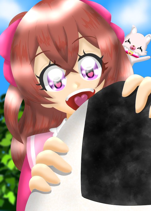 以前に描いたトロプリ最終回でまなつちゃんが仮装したおにぎりを食べようとしたゆいちゃんの似顔絵でお祝いします