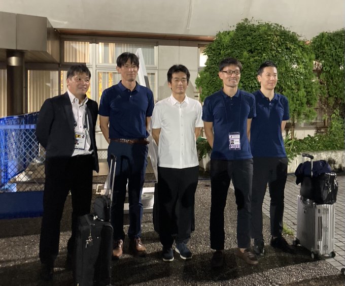 右から山内さん(副審1)、佐藤隆治さん(主審)、日比野さん(副審2)、中村さん(四審)、扇谷さん