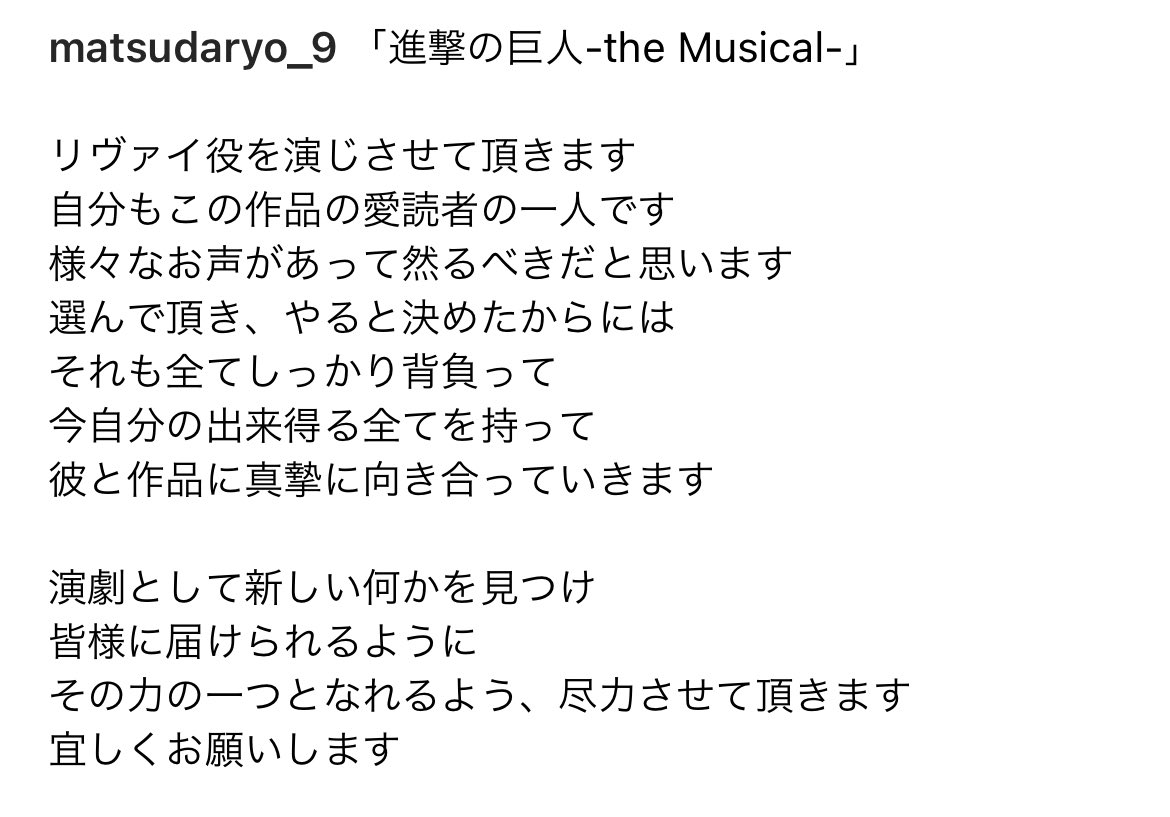 「進撃の巨人」-the Musical-にリヴァイ役で松田凌、コニー・スプリンガー役で中西智也が出演させていただきます。