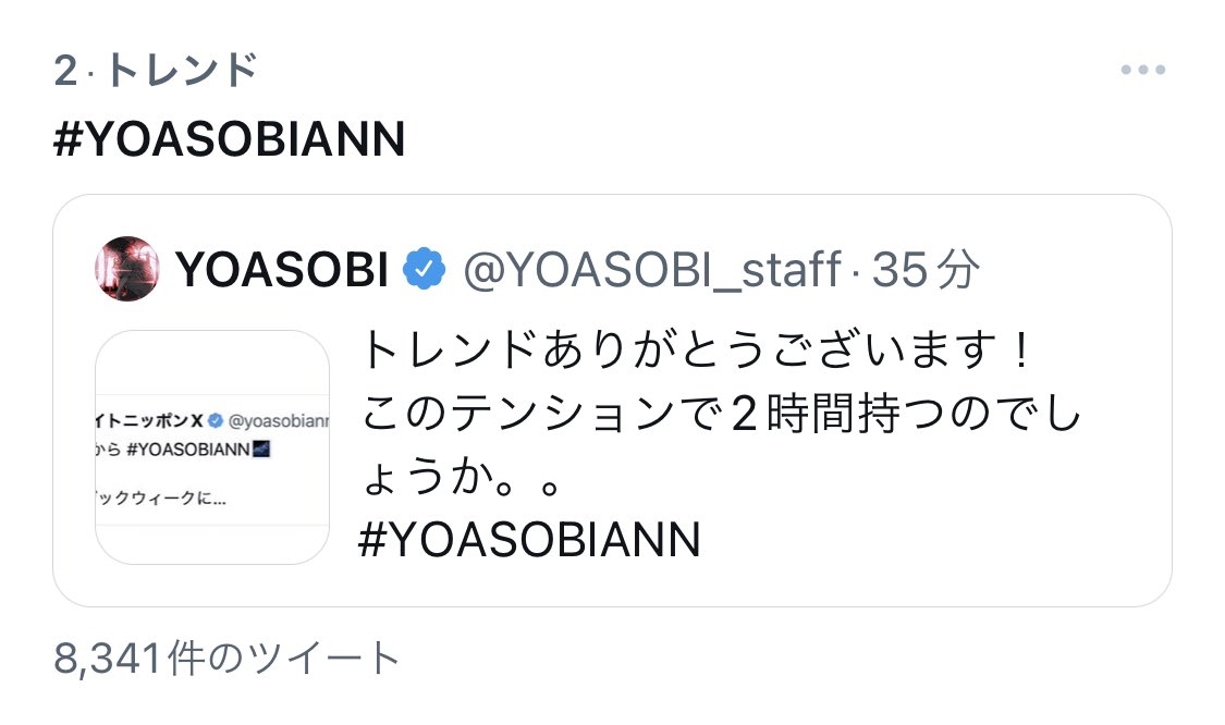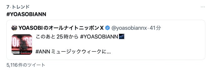 YOASOBIANN [2022年9月17日(土)] 2022年9月17日(土)03:00 OASOBIANN当ページのリンクには広告を含む場合があります YOASOBI @YOASOBI_staff #YOASOBIANN 変わってしまったAyaseさんを尻目にトレンド2位!ありがとうございます🔥🔥🔥 https://t.co/JEdQPmcNgg YOASOBI @YOASOBI_staff #YOASOBIANN あと約9,000人で400万人!!笑 未登録の方、こちらからぜひお願いします↓ https://t.co/O35aqU8wCW https://t.co/foJdzR6YJk YOASOBI @YOASOBI_staff トレンドありがとうございます! このテンションで2時間持つのでしょうか。。 #YOASOBIANN https://t.co/RUfqEXViw9 コメント名前 コメント 投稿する