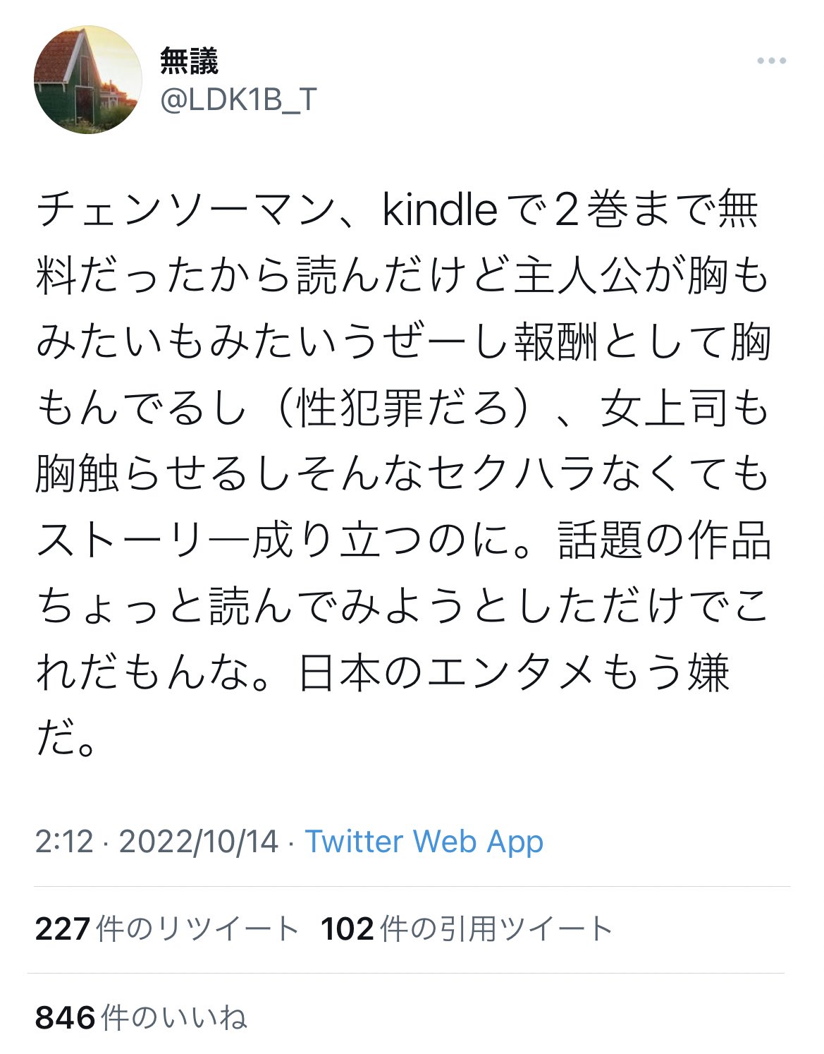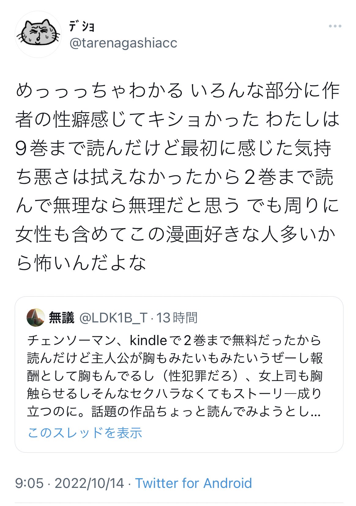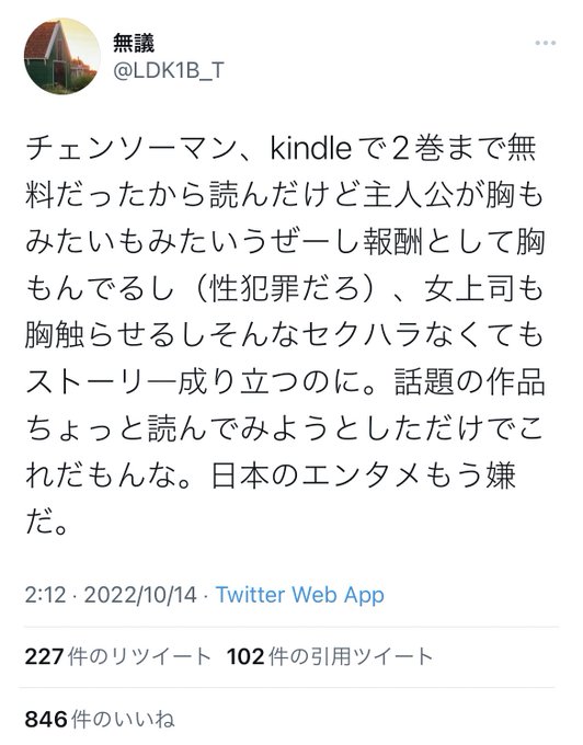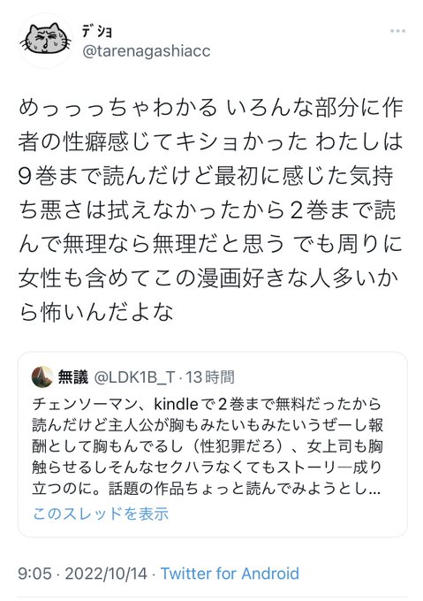 あの界隈でチェンソーマンで藤本タツキ先生の性癖が反映された描写が色々言われているようですが、ここで進撃の巨人の諫山創先生の名言を見てみましょう https://t.co/xeG5VdmVPK