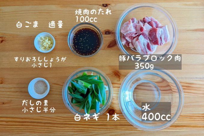①釜に豚バラブロック肉、水、焼肉のたれ、白ネギ、だしの素、生姜を混ぜて炊飯器スイッチを押す