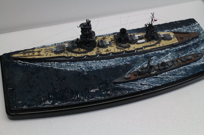 完成しました! スリガオ海峡を進撃する戦艦山城と駆逐艦時雨の1/700ジオラマです!何とか艦これアニメ放送日に間に合いました…! #プラモデル #艦これ https://t.co/IuAADVlLew