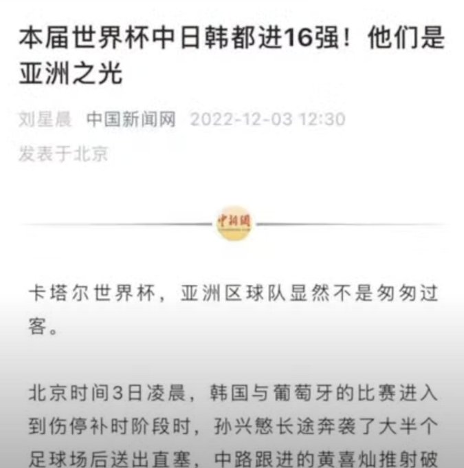 中共機関メディア「ワールドカップに中日韓でも16強に入った、アジアの光だ」