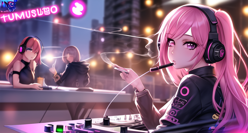 女子高生DJがタバコ吸ってるイラストをAIに描かせようとすると異常設定で気が狂って、機材を口に咥えて、指自体を燃やしてしまう