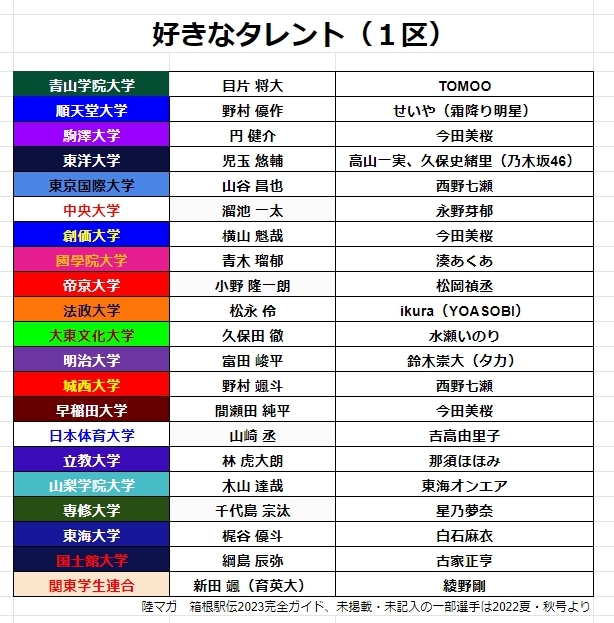 好きなタレント、1区選手。TOMOOさんはシンガーソングライター。湊あくあさんはVtuber。松岡禎丞さんは声優。星乃夢奈さんは仮面ライダーギーツ出演中。綾野剛さんは昨日結婚発表されました。