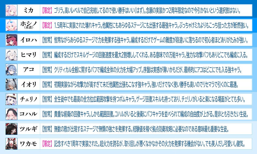 選出基準はブルアカをはじめたばかりの先生にとって助けになるかどうか、弱い時から強い時、様々な任務、ステージ、幅広く活躍できるか。表の上から有用という感じ。 https://t.co/s0tmFMaDJo