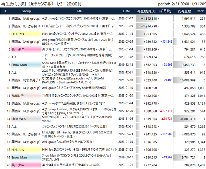 Jr.チャンネル Youtube 1月の総再生数トップ20