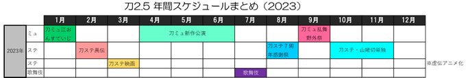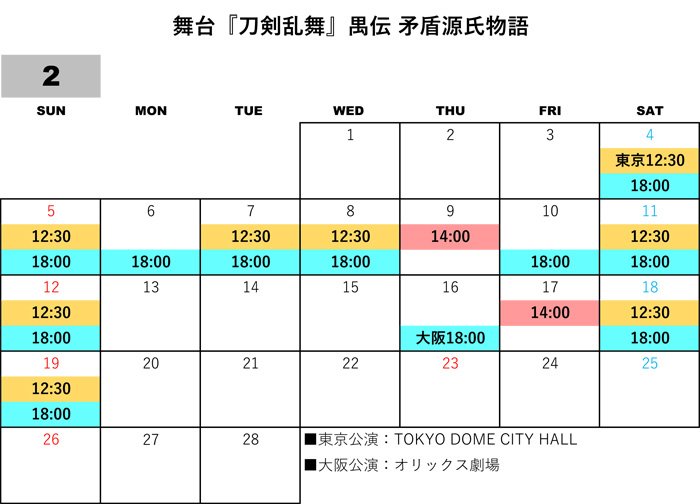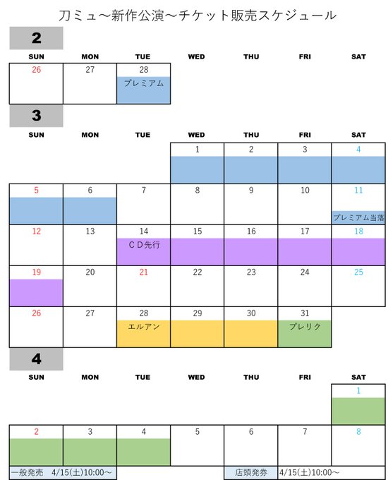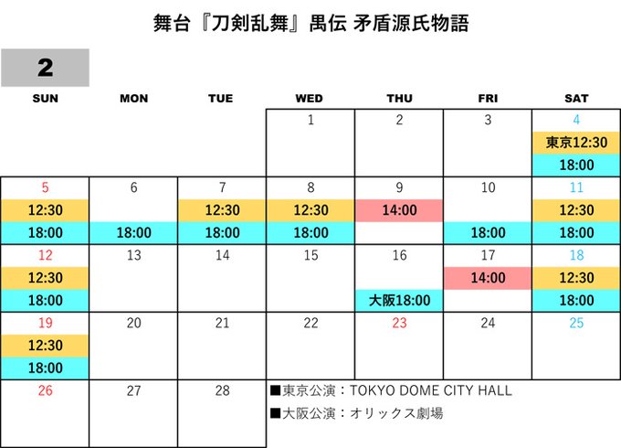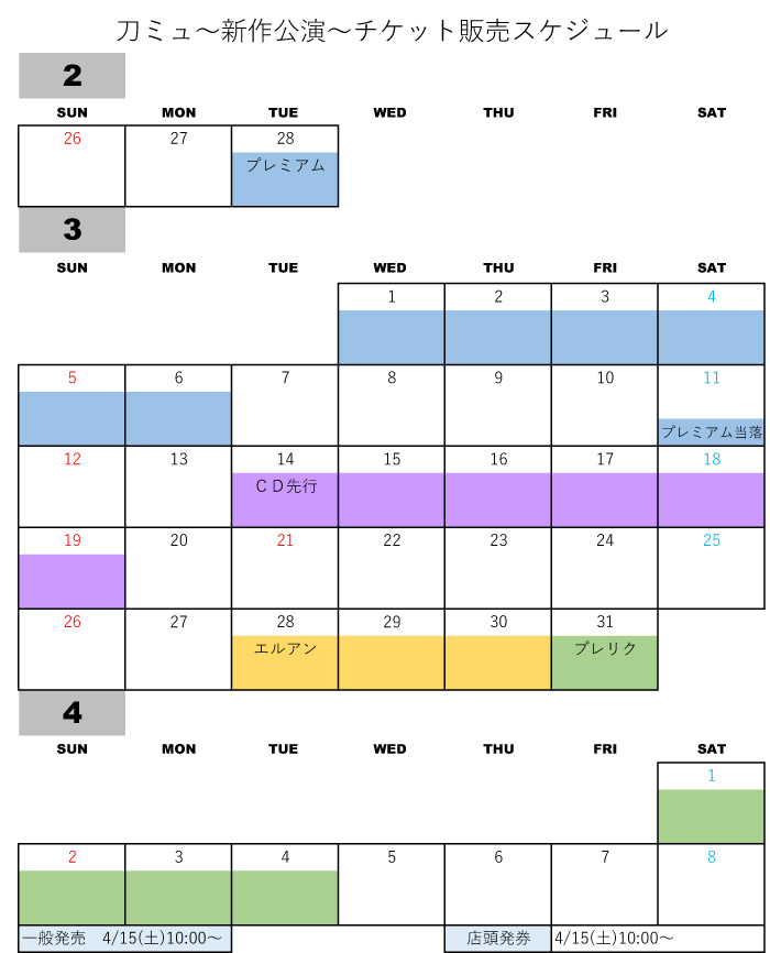ミュージカル『刀剣乱舞』新作公演 の「各種先行」と「公演スケジュール」をカレンダーにまとめました。