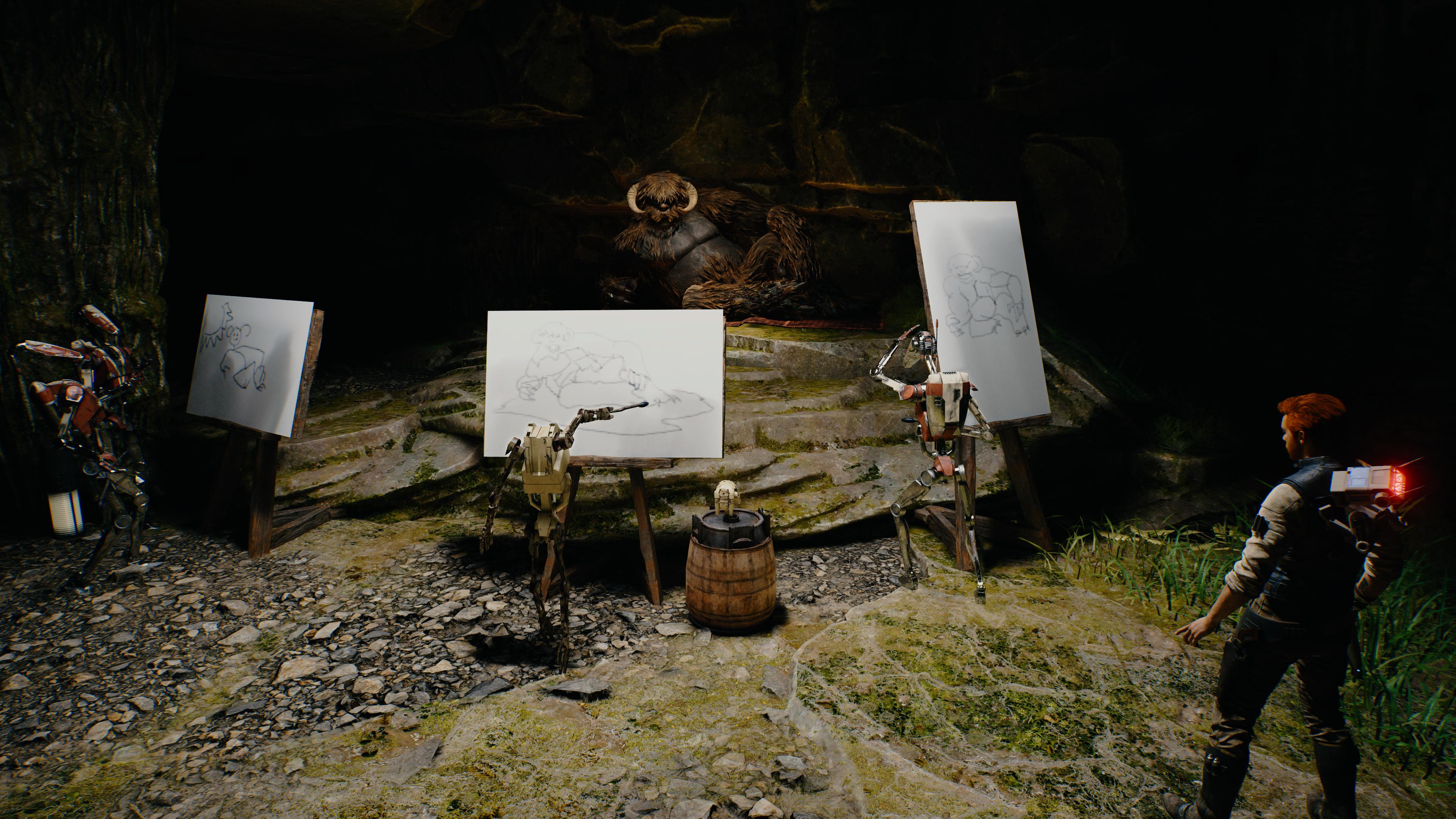STARWARSジェダイサバイバー、バグみたいな隠し道をひたすら進んでたら、バトルドロイドたちによるいかがわしい絵画教室にたどり着いたんだけど何これ!?