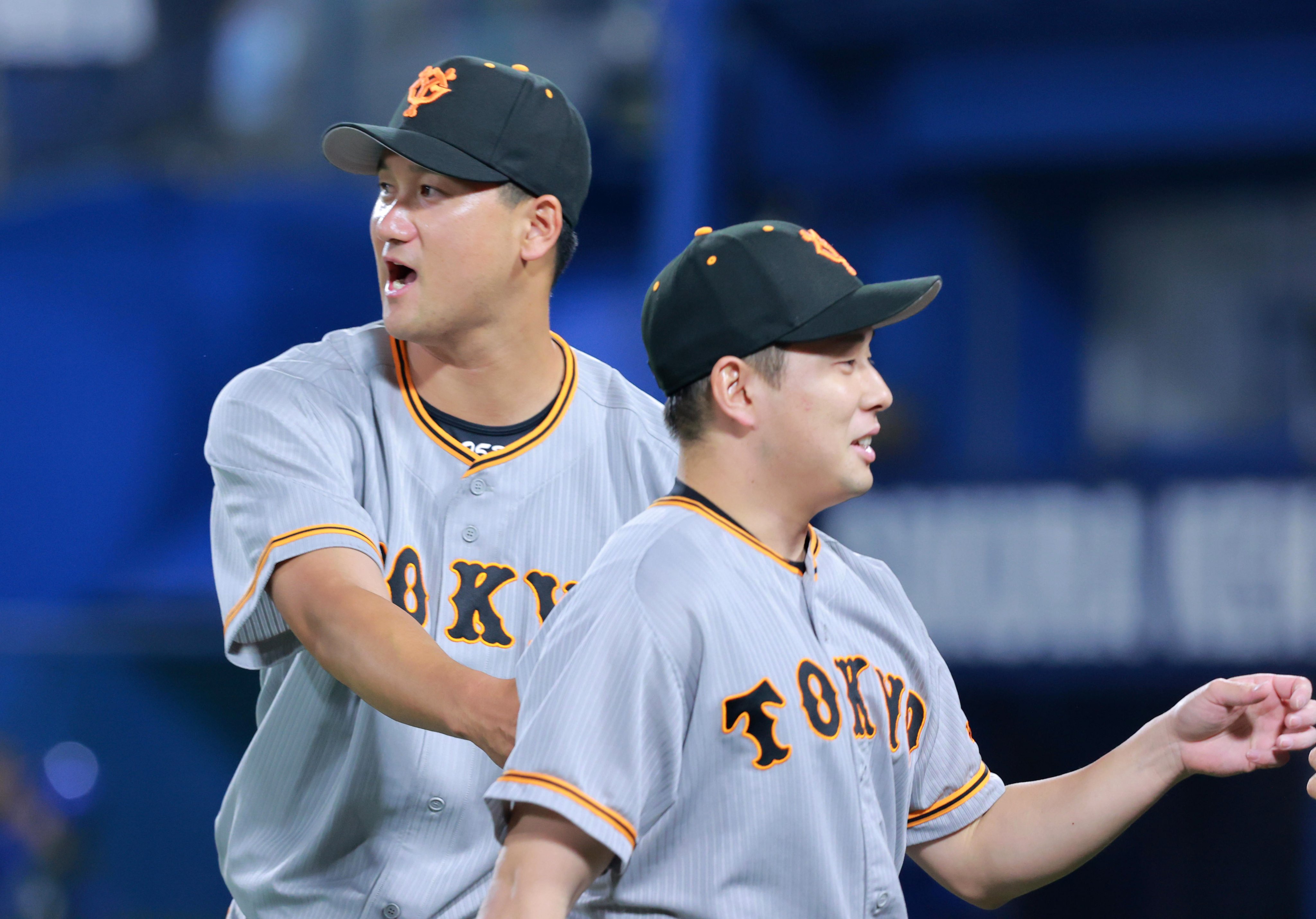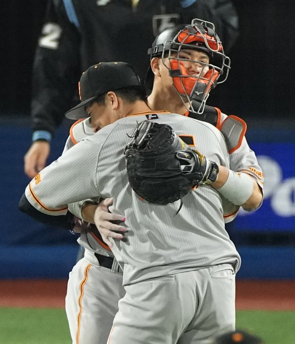 勝利を決めた #大勢- #大城卓三 バッテリーがガッチリハグ(撮影・荒木孝雄、加藤圭祐)