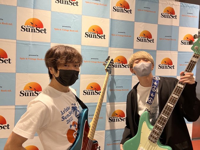 有明サンセット2022ありがとうございました!インディーズ時代に田村さんに憧れて勝手にオーダーした青色のベース、まさか交換してツーショットが撮れるなんて…にやけ顔になってます! https://t.co/WJwqBL9GkV